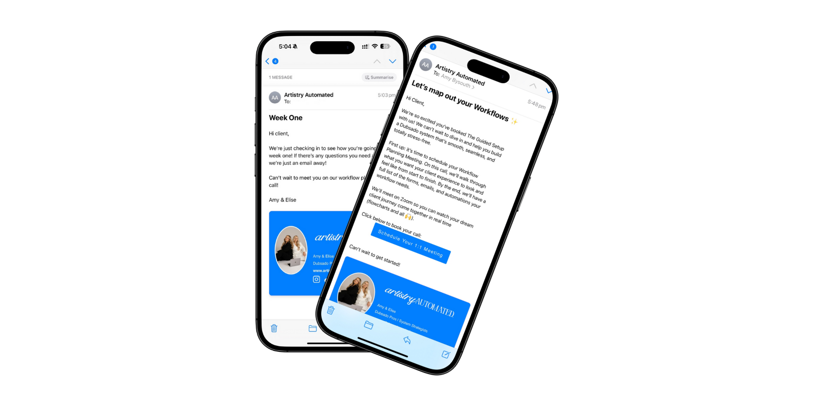 Customisable email templates and Canva form graphics to help you brand your forms, plus personalised workflows mapped for your business and handed over for you to build in Dubsado. Everything is created to make setting up your client experience as easy and streamlined as possible.